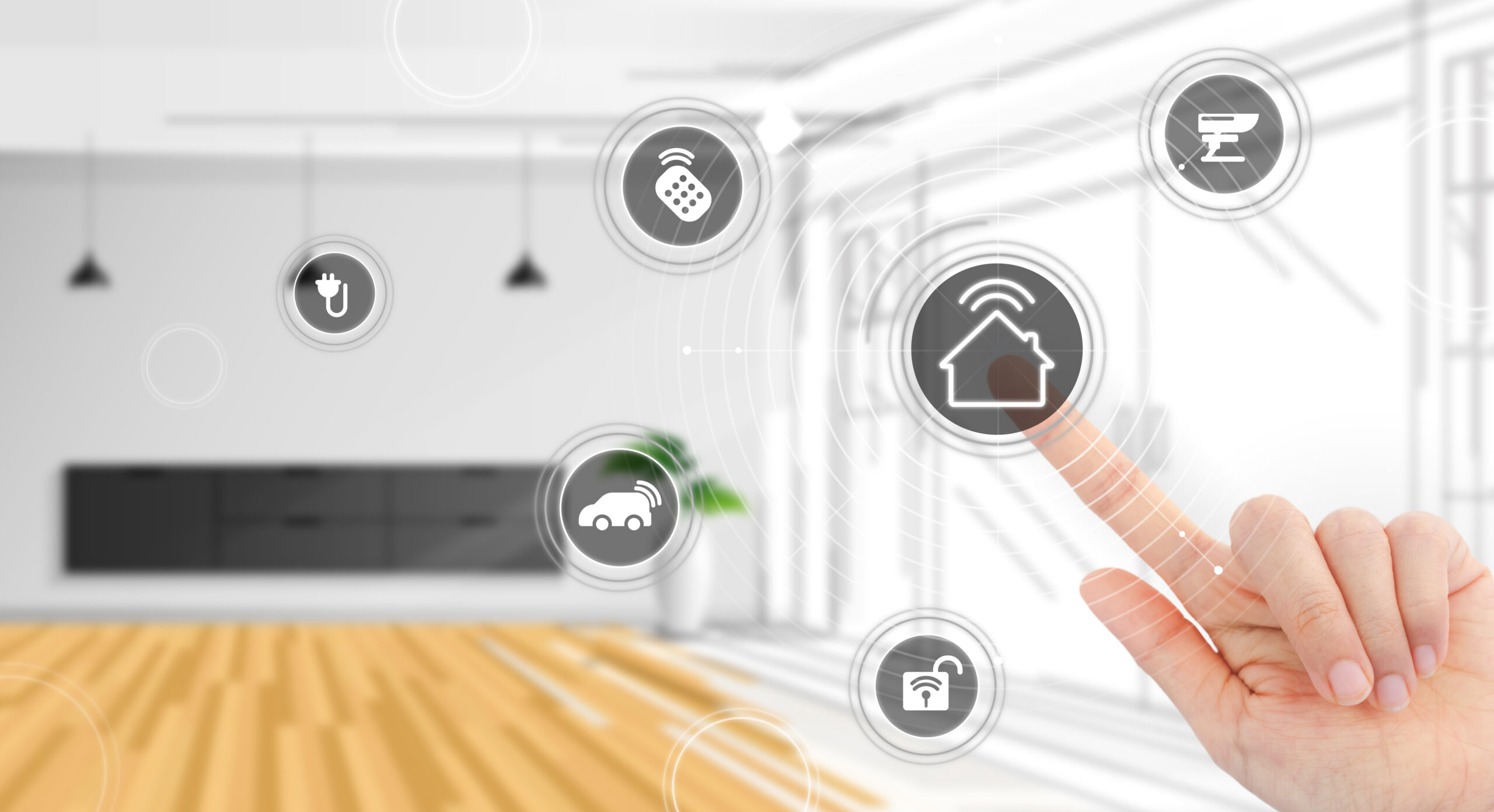Illustration of a smart home with energy optimization, local energy storage, automatic maintenance, and improved resident comfort